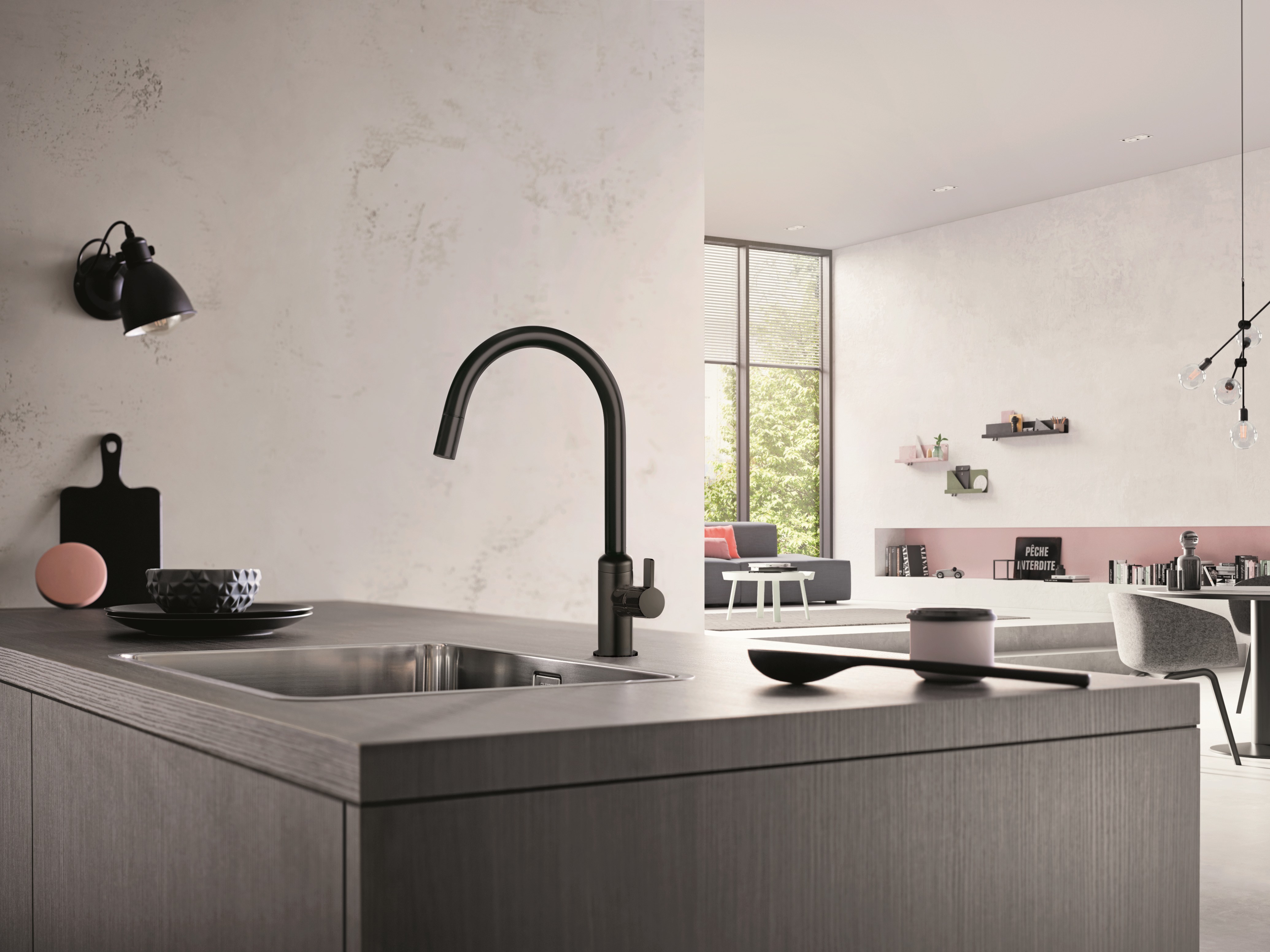 Bateria kuchenna czarna doskonale prezentuje się chociażby w połączeniu z granitowym zlewozmywakiem, i to niekoniecznie w dokładnie takim samym kolorze. Doskonałym kompanem dla czerni jest np. antracytowa szarość. Taki duet – stanowiący jeden z istotniejszych elementów wyposażenia kuchni – prezentuje się elegancko, a przy tym bardzo efektownie. Warto chociażby zwrócić uwagę na baterię kuchenną KLUDI z linii BINGO STAR XS. Wykończenie czarny mat malowniczo i miękko rozkłada światło. Jest też łatwiejsze do utrzymania w czystości niż połyskująca czerń. Sama bateria zaś wyróżnia się smukłym łukiem wylewki, a także delikatnym, minimalistycznym uchwytem. Co ważne, dostępny jest model tej baterii z wyciąganą wylewką. Dzięki temu znacznie zwiększa się jej możliwy zasięg, przez co np. napełnianie dużych naczyń, które nie mieszczą się w zlewozmywaku, jest o wiele wygodniejsze.